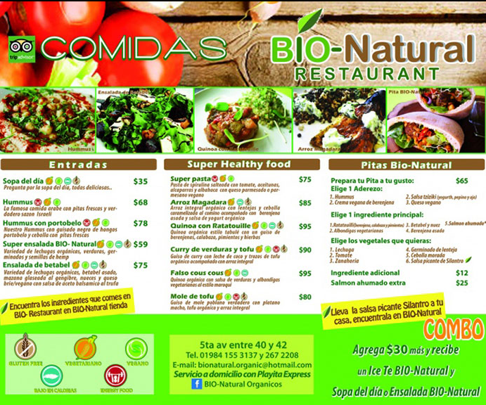 Meals. We will eat out together as a group at as healthy of restaurants as possible. (with organic, vegan, gluten free options). You will be responsible for paying for your own meals (except for 2 lunches which are included). Plan on spending about $50 per person per day for meals. You can spend more or less, but you don’t need to. You can find good food for reasonable prices in Playa Del Carmen. A day might look like $12 breakfast, $13 lunch, $25 dinner. 100 Pesos equals $5.50 US. For example we eat at organic places like Bio-Natural that has a vegan Super Pasta for 75 Pesos which is $4.11 US. Other healthy restaurants are La Senda and Raw Love in Tulum.