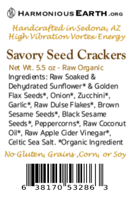 $9 per package. Organic Raw Sprouted & Dehydrated Seed, Veggie, and Spice Crackers. No-Gluten, Grains, Corn, Rice or Soy. Handcrafted in the high vibration vortex energy of Sedona, AZ. Satisfying, delicious and so good for you!